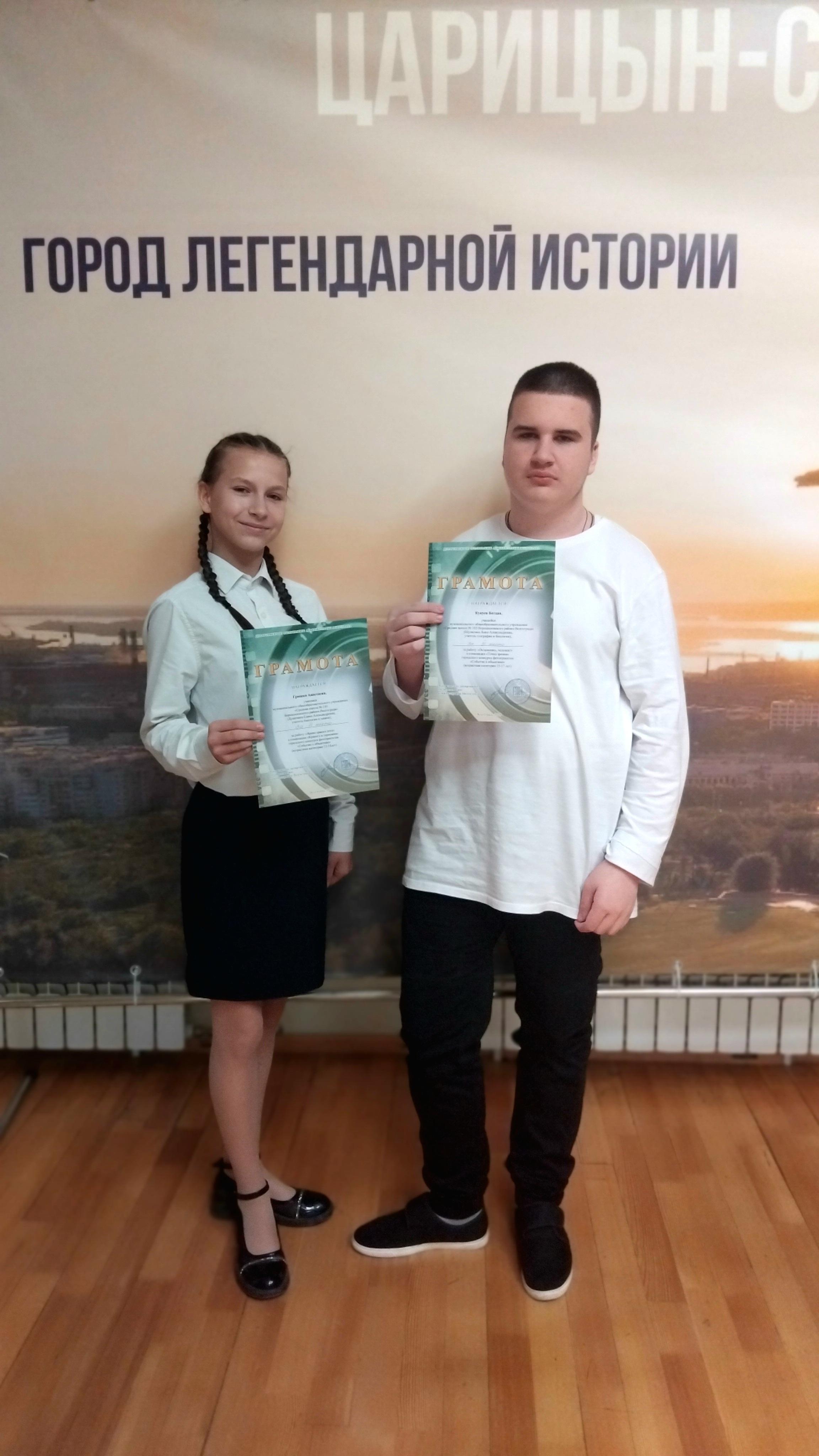 17 и 19 ноября в Детско-юношеском центре Волгограда прошел финальный этап городского конкурса фотопроектов «Событие в объективе». Учитель биологии и химии Душевина Елена Александровна заняла 2 место, а учащиеся МОУ СШ № 105 Гришко Анастасия и Кукуев Богдан заняли 3 место. ПОЗДРАВЛЯЕМ!